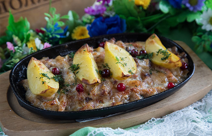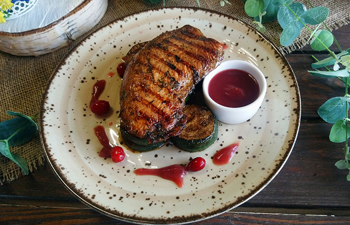 Основа меню — всем знакомая и понятная славянская кухня. Целый раздел посвящён хиту белорусской кухни — драникам. У нас вы можете съесть классические драники со сметаной или взять что-то более существенное, например, с фрикасе из кролика или с домашней грудинкой, луком и яйцом. Изюминка меню — блюда из дичи: стейк из лося, мясо бобра в клюквенно-коньячном соусе, строганина из мяса оленя и другие блюда. Вот полное меню дичи. Не менее популярный раздел, особенно летом и для отдыха в беседках, — это блюда живого огня: шашлыки, кебабы, овощи, рыба.